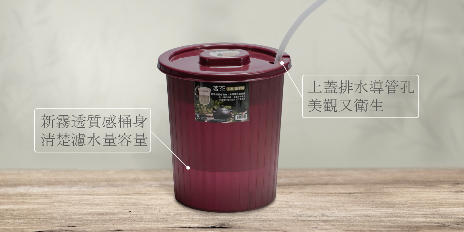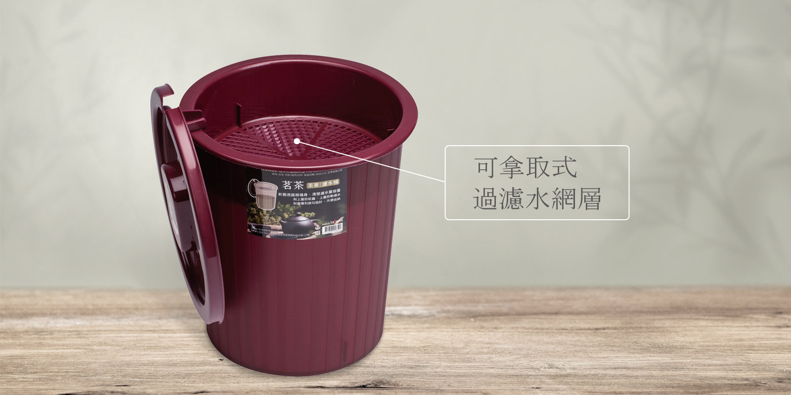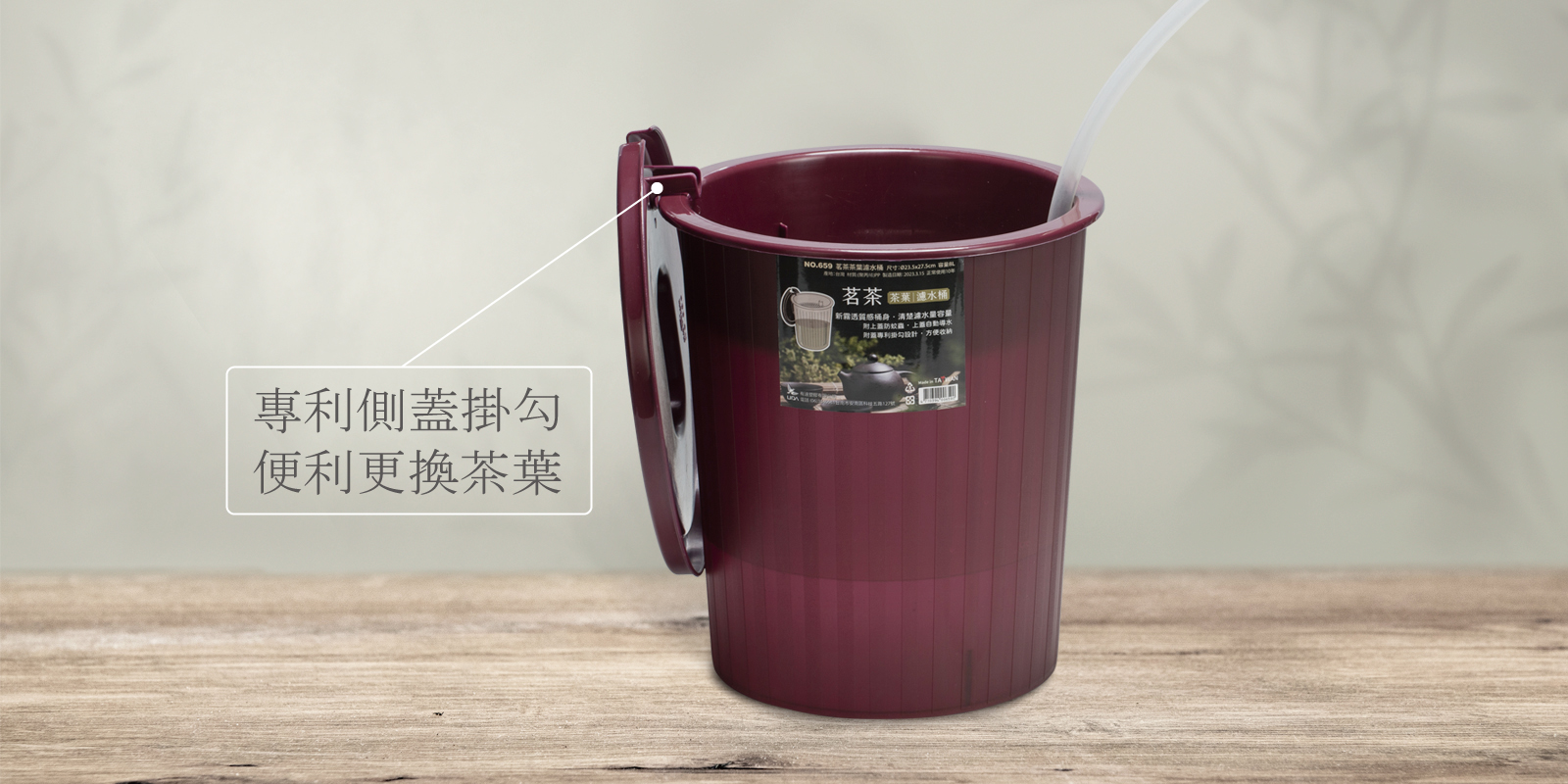 659 茗茶茶葉濾水桶 上蓋側掛美觀設計,側邊水管孔濾水網貼心使用 編號659入數36 Pcs/件尺寸Ø25 × 27H cm.容量 7L材質PP(聚丙烯)Color棗紅色條碼4710394006590